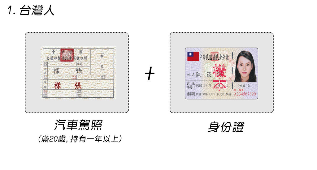 - 大陸港澳人士:有效IDP國際駕照※、當地駕照、大陸護照、VISA/MASTER/JCB信用卡、入台證。